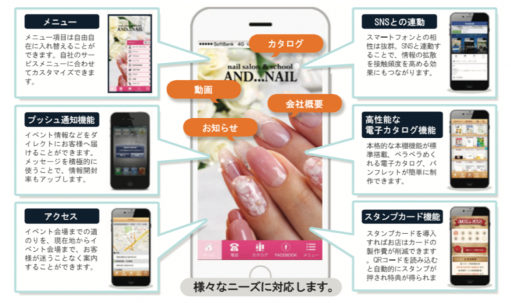 飲食店、エステ、美容院、コーポレイト、ECサイト、学校、病院、ホテル、旅行社、工務店、アーティスト、アスリート、個人、上場企業などのIRアプリ、企業のリクルートアプリ、会員だけに提供する会員アプリ、社内だけが利用する非公開アプリなどどんな業種にも適用できます。デザインやメニュー名なども自由に変更ができます。